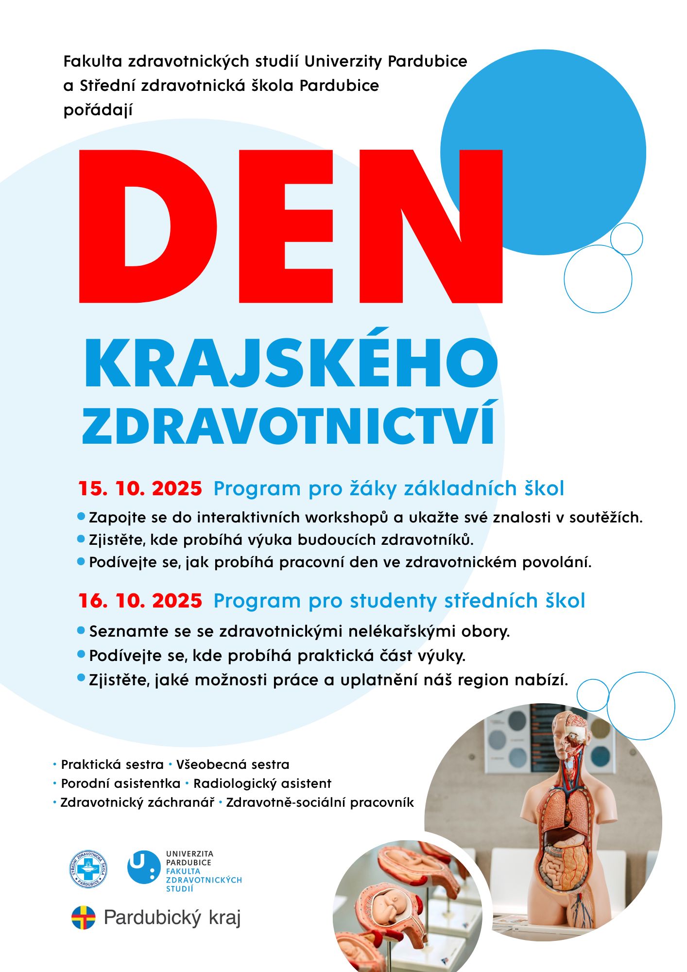![]() | Den krajského zdravotnictví 2025Již popáté vás Fakulta zdravotnických studií ve spolupráci se Střední zdravotnickou školou Pardubice zve na Den krajského zdravotnictví, který se uskuteční 15. a 16. 10. ve vestibulu a odborných učebnách FZS. Co vás čekáBudete mít možnost nahlédnout pod pokličku světa zdravotnických profesí. Přiblížíme práci praktické sestry, všeobecné sestry, porodní asistentky, radiologického asistenta, zdravotnického záchranáře i zdravotně-sociálního pracovníka. Dozvíte se, co jednotlivá povolání obnášejí, jaké dovednosti vyžadují a proč jsou dlouhodobě žádaná na trhu práce. |