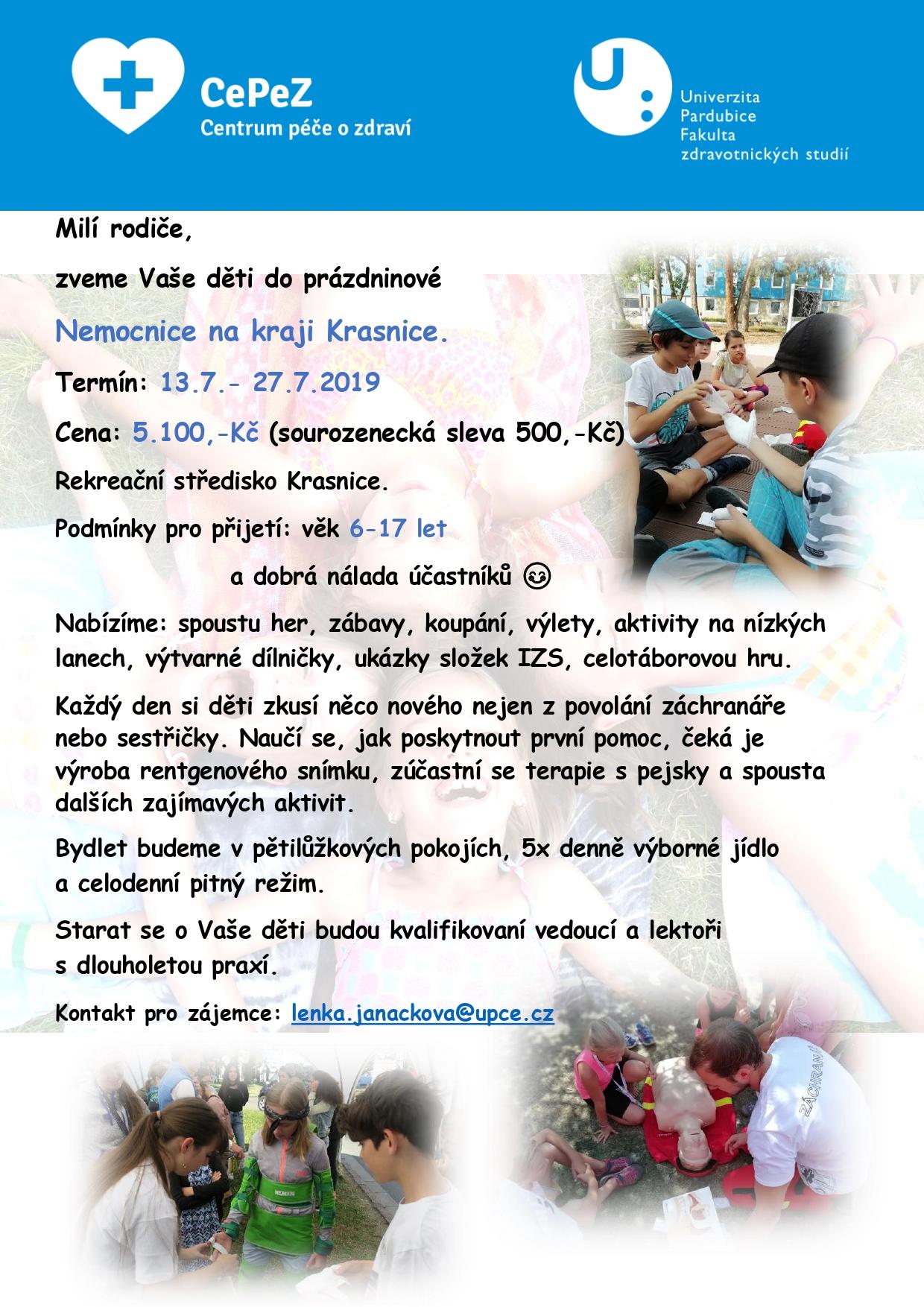 Děti se mají určitě na co těšit. Každý den si zkusí něco nového nejen z povolání záchranáře nebo sestřičky. Naučí se, jak poskytnout první pomoc, vyrobí si rentgenový snímek, zúčastní se terapie s pejsky a spousty dalších zajímavých aktivit.